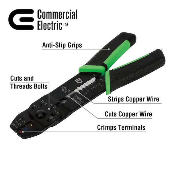• Multi-function tool threads, crimps, strips, bends and loops wire