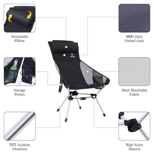 Compact High Back Camping Chair, Lightweight Foldable Camp Chair with Pillow & Carry Bag for Outdoors (Black, 1 Pack)