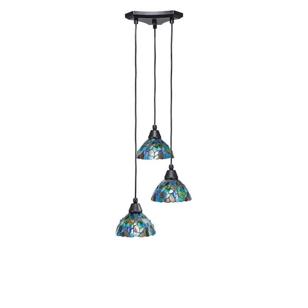Condor 3 Light Matte Black, Cluster Pendant Light with 7 in. Blue Mosaic Art Glass Shades, No bulbs included