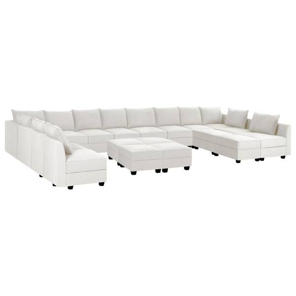 Contemporary 13 Seater Upholstered Sectional Sofa with 6 Ottoman - White Down Linen Living Room Set