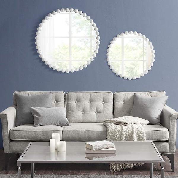 Contemporary 36 in. W. x 36 in. H Round Framed White Wall Mirror with Beaded Decoration, for Bedroom, Entryway