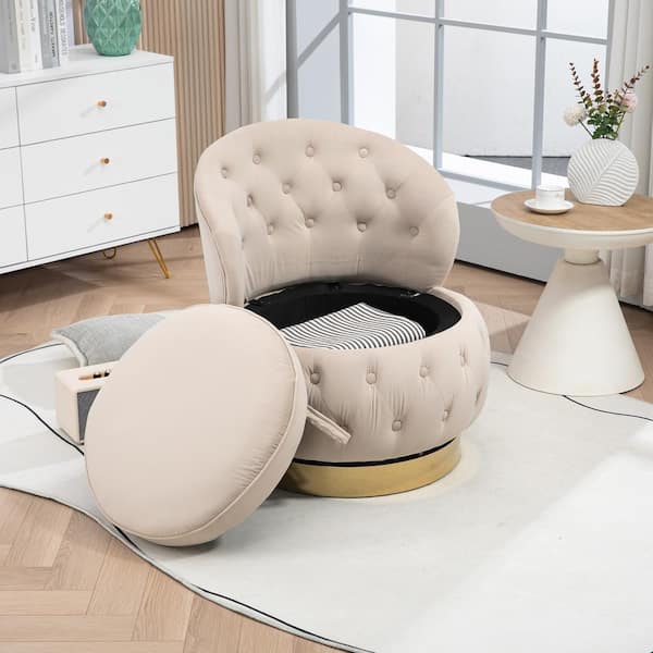 Contemporary Beige Velvet Upholstered Wide Seat Cuddle Swivel Barrel Chair with Storage