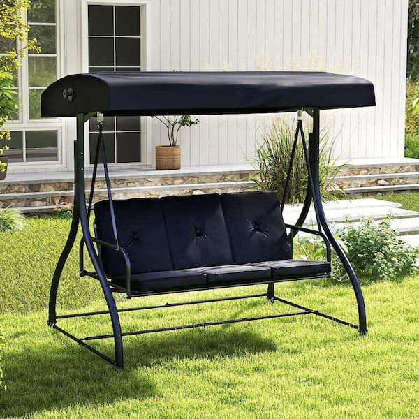 Converting Patio Swing Chair Porch Swing Bed with Adjustable Canopy and Thickened Cushion Black