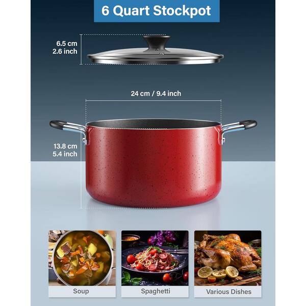 6 qt. Professional Nonstick Aluminum Stockpot Soup pot Casserole with Lid, Marble Red