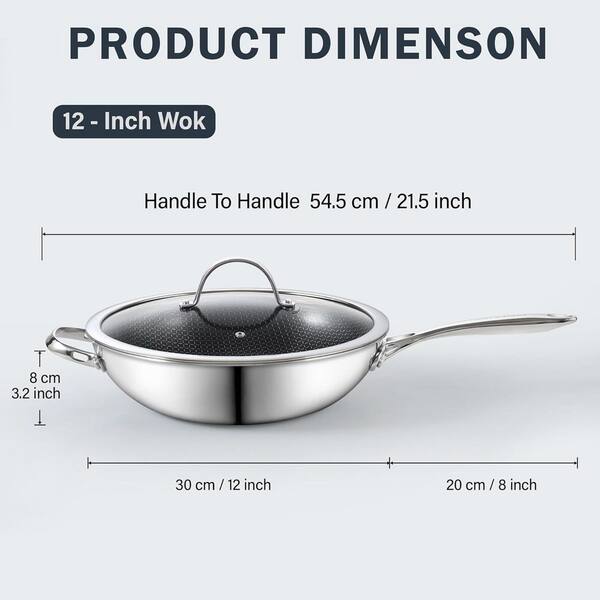 12 in. Multiply Clad Stainless Steel Hybrid Nonstick Flat Bottom Wok with Glass Lid, Compatible with All Stovetops
