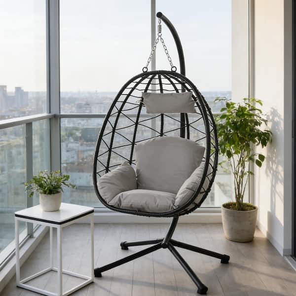 1-Person Egg Swing Chair Black Wicker Outdoor Patio Hanging Chair with Light Gray Cushion