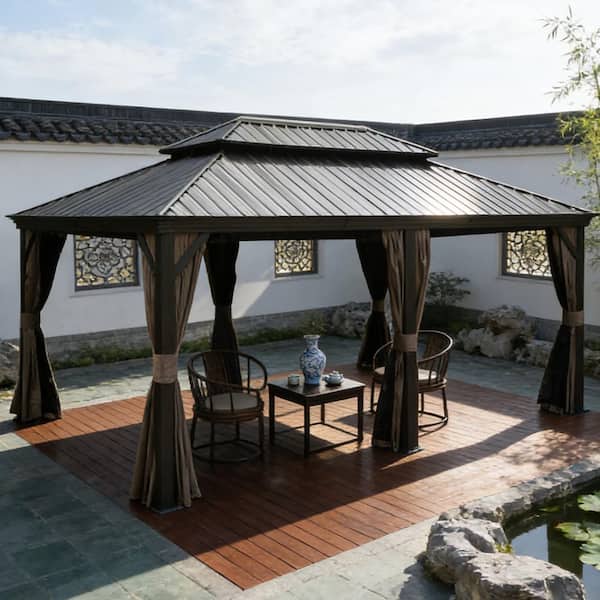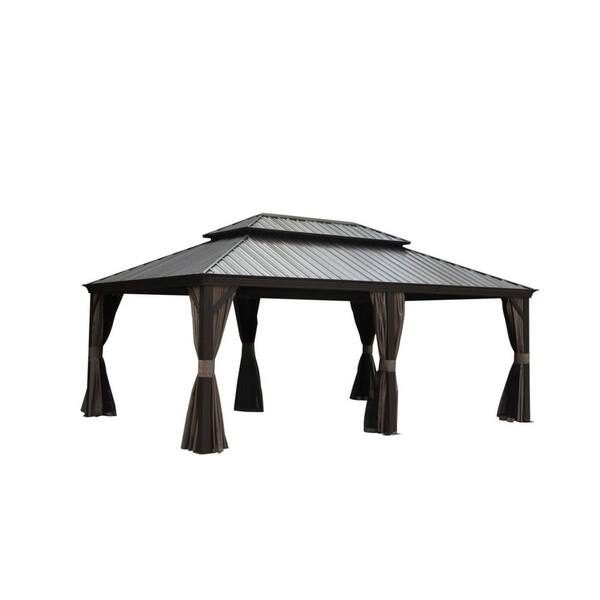 14 ft. x 20 ft. Outdoor Brown Aluminum Hardtop Gazebo with Galvanized Steel Double Roof