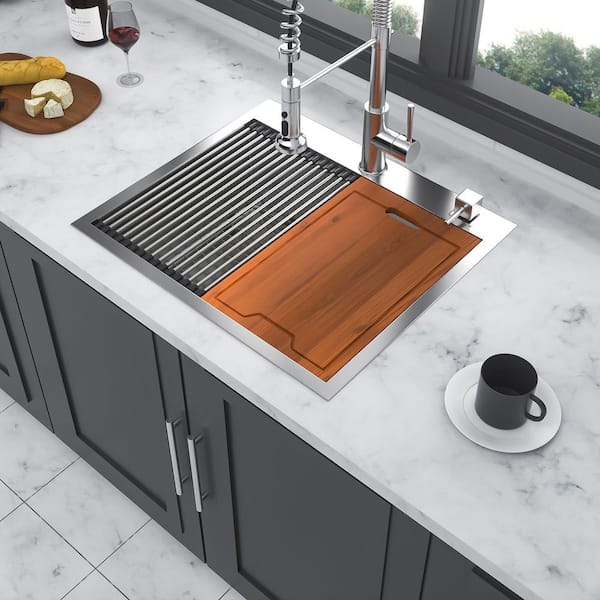 25 in. Drop-in Single Bowl 16 Gauge Brushed Nickel Stainless Steel Kitchen Sink with Workstation