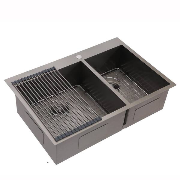 33 in. Drop-in Double Bowl (60/40) 16-Gauge Gunmetal Black Stainless Steel Kitchen Sink with Bottom Grids