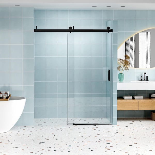56 to 60 in. W x 76 in. H Single Sliding Frameless Shower Door in Matte Black with Clear Glass