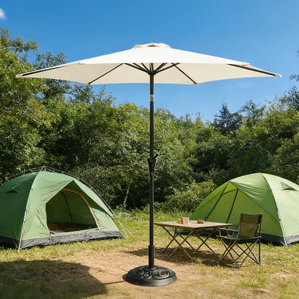 8.9 ft. Creme Outdoor Market Patio Umbrella with 33 lbs. Round Resin Umbrella Base, Push Button Tilt and Crank Lift