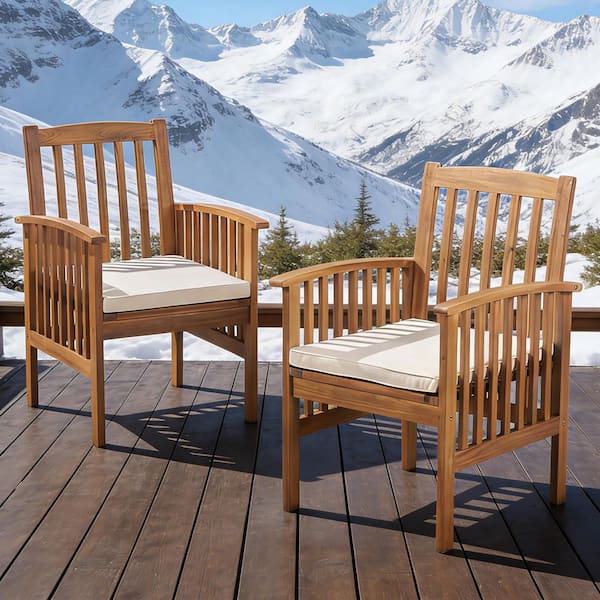 Brown Acacia Wood Outdoor Dining Chair with Cream Cushions (2-Pack)