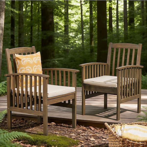 Grey Acacia Wood Outdoor Dining Chair with Cream Cushions (2-Pack)