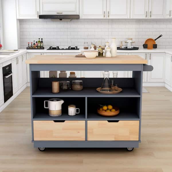 Grey Blue Rubber Wood Kitchen Cart with Wine and Towel Rack