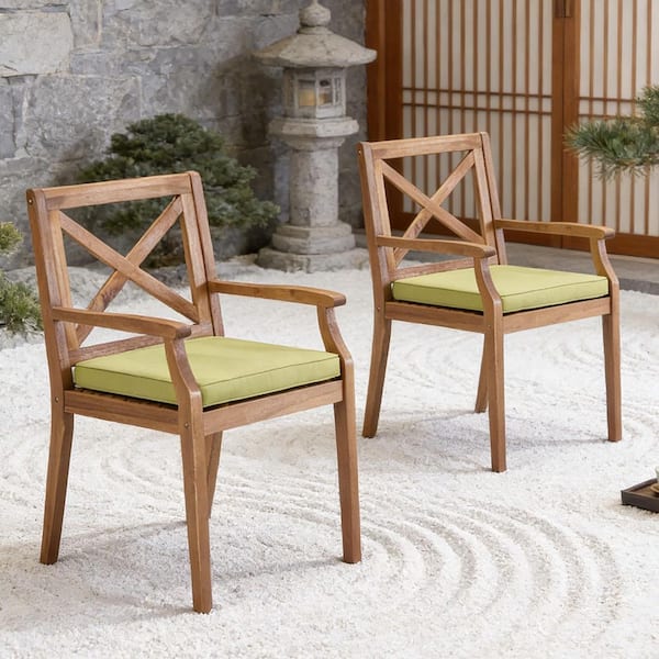 Teak Acacia Wood Outdoor Dining Chair with Green Cushions (2-Pack)