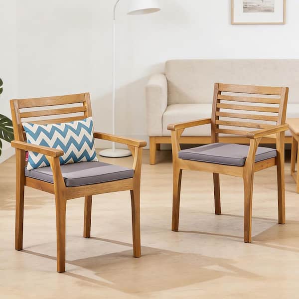 Teak Acacia Wood Outdoor Dining Chair with Grey Cushions (2-Pack)