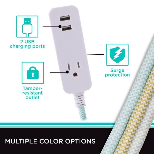 10 ft. Decor Extension Cord Surge Protector with 2 USB Charging Ports 2.4 Amp 1 Grounded Outlet, Mint/White