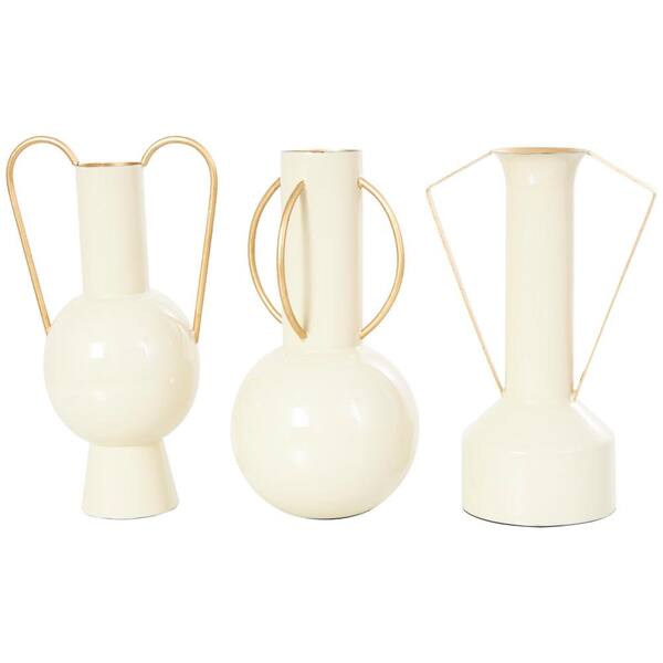 Cream Metal Abstract Decorative Vase with Varying Shapes and Geometric Gold Handles (Set of 3)