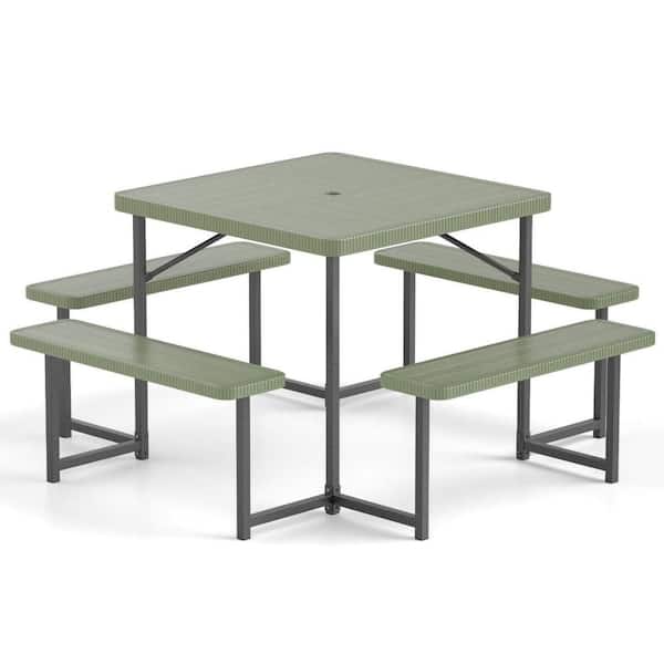 1-Piece Plastic Outdoor Dining Set Picnic Table Bench Set for 4-8 People with Umbrella Hole All-Weather Green