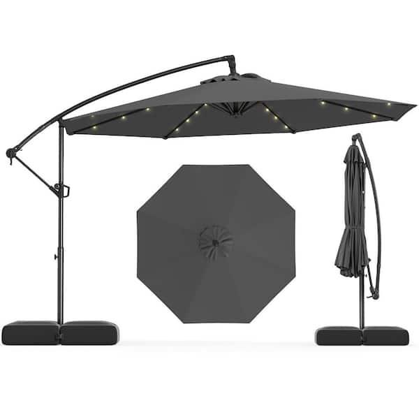 10 ft. Metal Cantilever Solar Tilt Offset Hanging Umbrella Patio Umbrella with 32 LED Lights in Gray