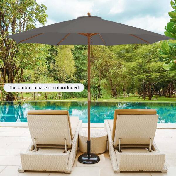 10 ft. Wooden Market Table Patio Umbrella Pulley with 8 Bamboo Ribs Sunshade Canopy in Gray