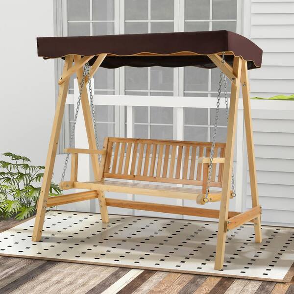 2-Person Wooden Garden Canopy Patio Swing A-frame with Weather-Resistant Canopy