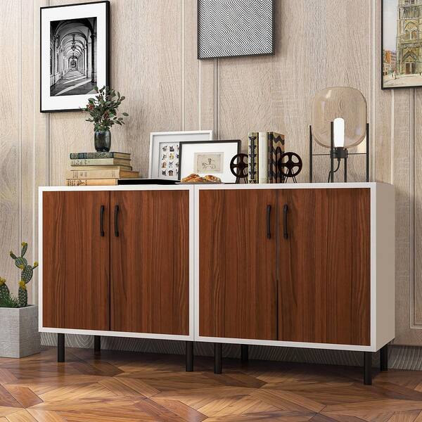 2-Pieces White and Walnut Wood 57 in. Sideboard Buffet Storage Cabinet Kitchen Cupboard with Adjustable Shelf