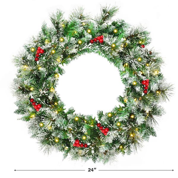 24 in. Pre-Lit Flocked Artificial Christmas Spruce Wreath with 50 LED Lights and Timer