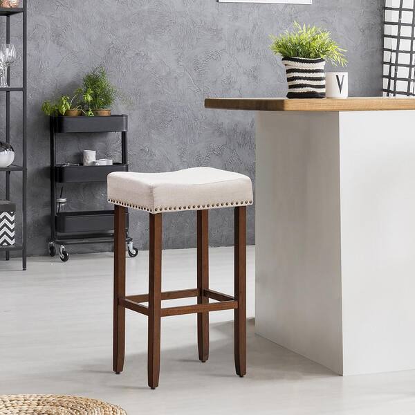 29 in. Beige Backless Nailhead Saddle Bar Stools Height with Fabric Seat and Wood Legs (Set of 4)