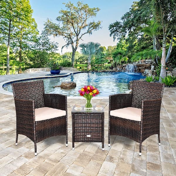 3-Piece PE Rattan Wicker Patio Conversation Set Outdoor Chairs and Coffee Table with Yellowish Cushion