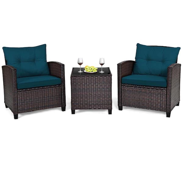 3-Piece Rattan Wicker Patio Conversation Set Sofa Coffee Table with Blue Cushions