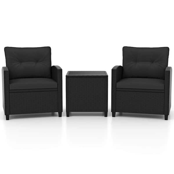 3-Piece Wicker Patio Conversation Set with Tempered Glass Coffee Table Washable Black Cushions