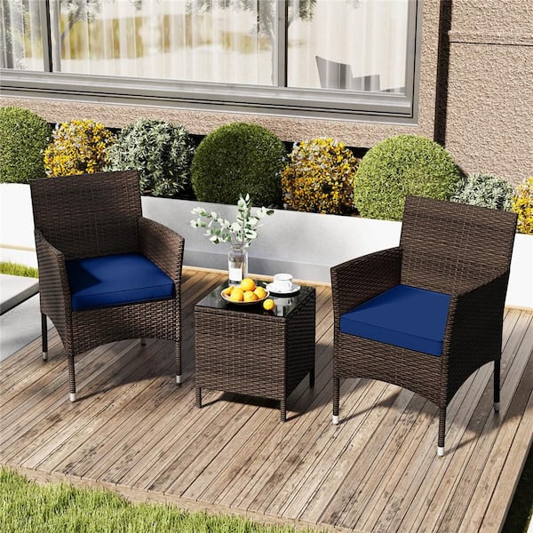 3-Piece Wicker Patio Conversation Set with Tempered Glass Tabletop and Navy Cushions