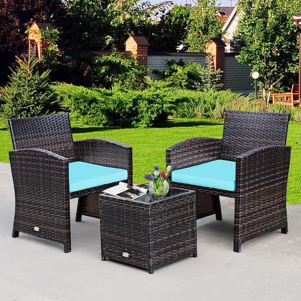 3-Piece Wicker Patio Conversation Set with Turquoise Cushions Sofa Coffee Table
