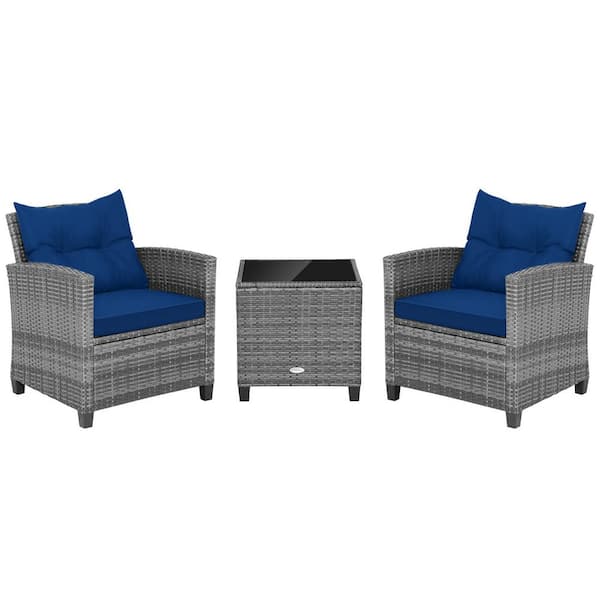 3-Pieces Wicker Patio Conversation Set Rattan Furniture Bistro Sofas Side Table with Navy Cushions