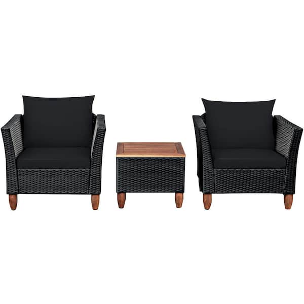 3-Pieces Wicker Patio Conversation Set Wooden Table Top with Black Cushions
