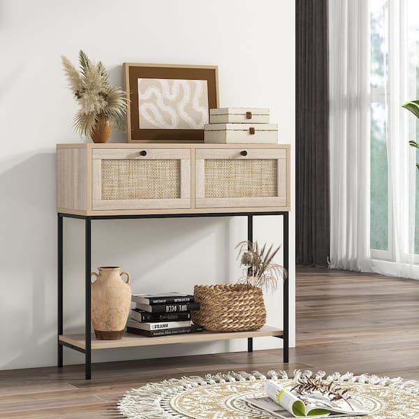 31.5 in. Oak Rectangle Wood Console Table with 2 Rattan Drawers, Open Storage Shelf Metal Legs