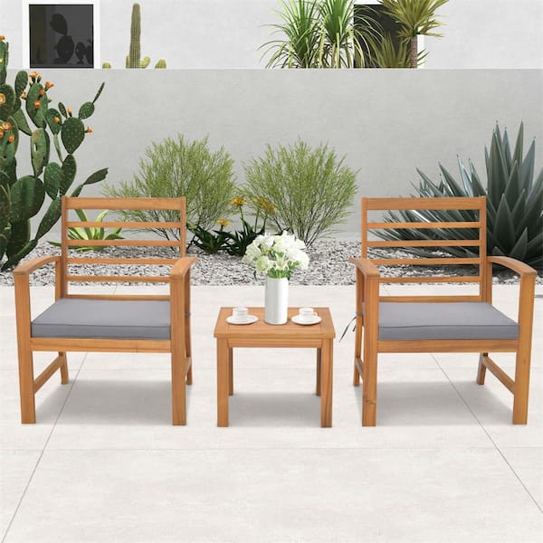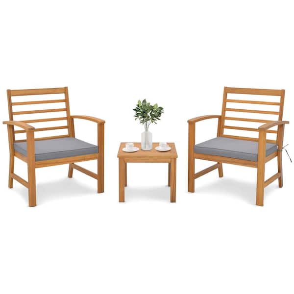 4-Piece Patio Wood Conversation Set with Soft Seat and Gray Cushions