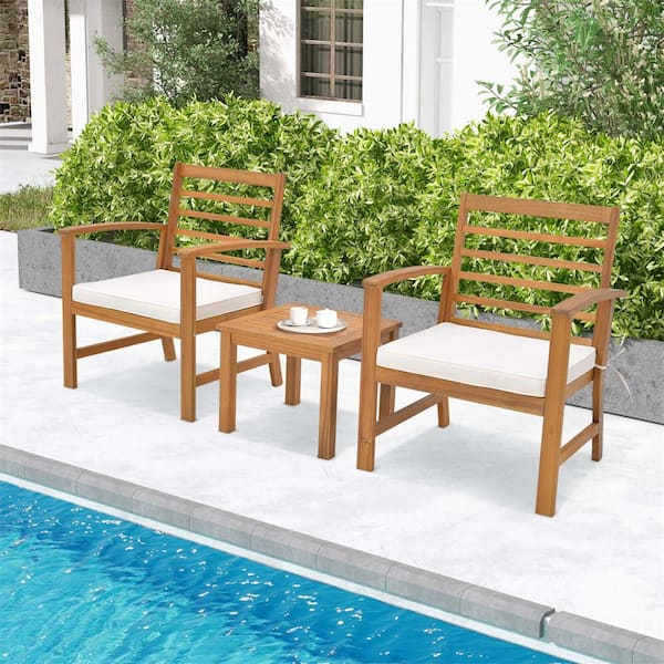 4-Piece Patio Wood Conversation Set with Soft Seat and White Cushions