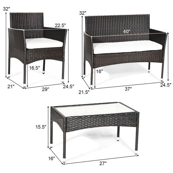4-Piece Wicker Patio Conversation Seating Set with Rattan Wicker Furniture Set, White Cushioned Chair Glass Table Top
