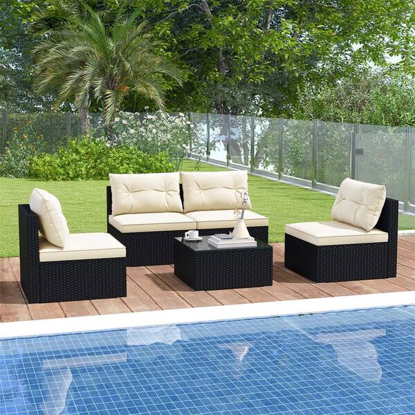 5-Piece Patio Rattan Wicker Furniture Conversation Set Cushioned Sofa Deck in Off White