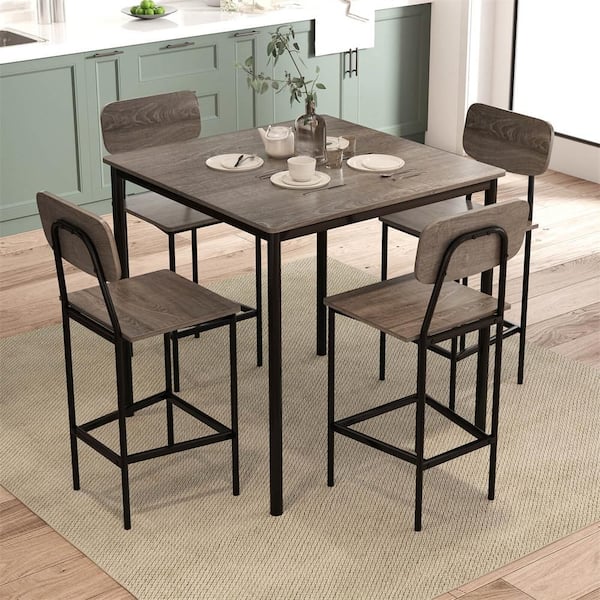 5-Piece Square Grey Wood Industrial Dining Table Set with Counter Height Table and 4 Bar Stools Black