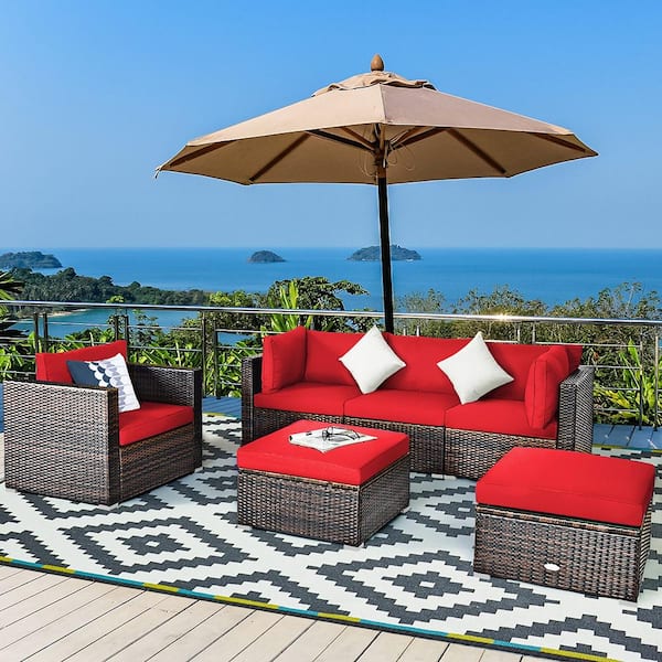 6-Piece PE Rattan Outdoor Sectional Set with Red Cushions