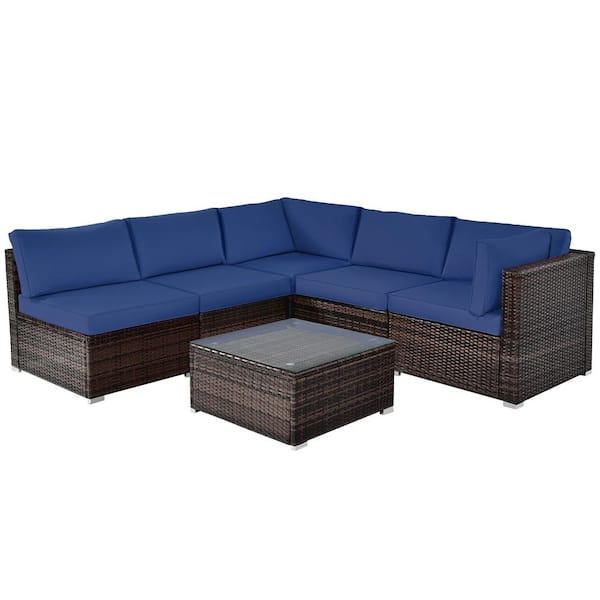 6-Piece Patio Navy Wicker Outdoor Sectional Set with Black Cushions