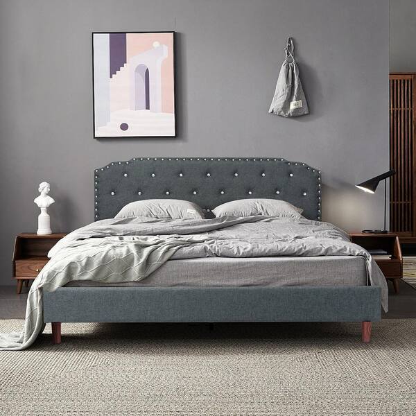 63 in. W Grey Queen Upholstered Platform Bed Frame Adjustable Diamond Button Headboard Easy Assembly