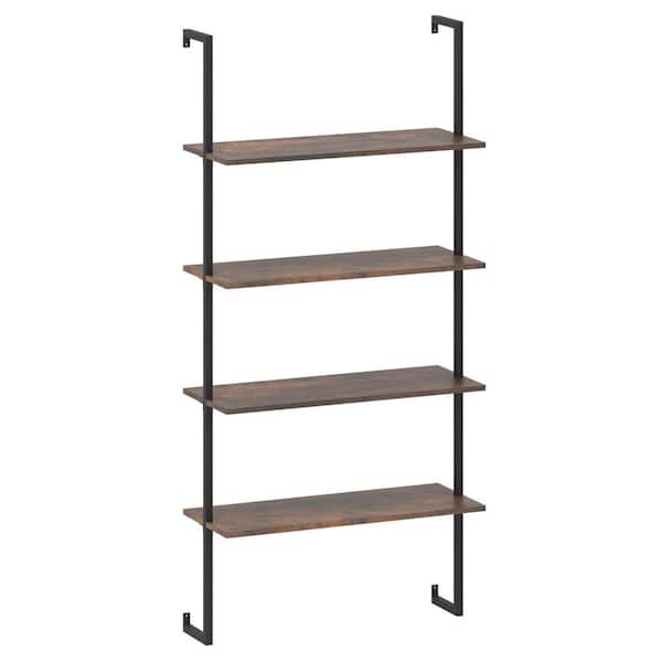 64 in. Coffee Wood 4-Shelf Ladder Bookcase Industrial Wall Shelf with Metal Frame Rustic Brown