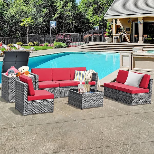 8-Piece Wicker Patio Conversation Set Rattan Furniture Storage Table with Red Cushions