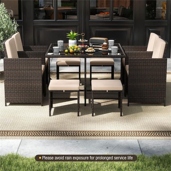 9-Piece Wicker Outdoor Dining Set with Tempered Glass Table and Ottoman Beige Removable Cushions