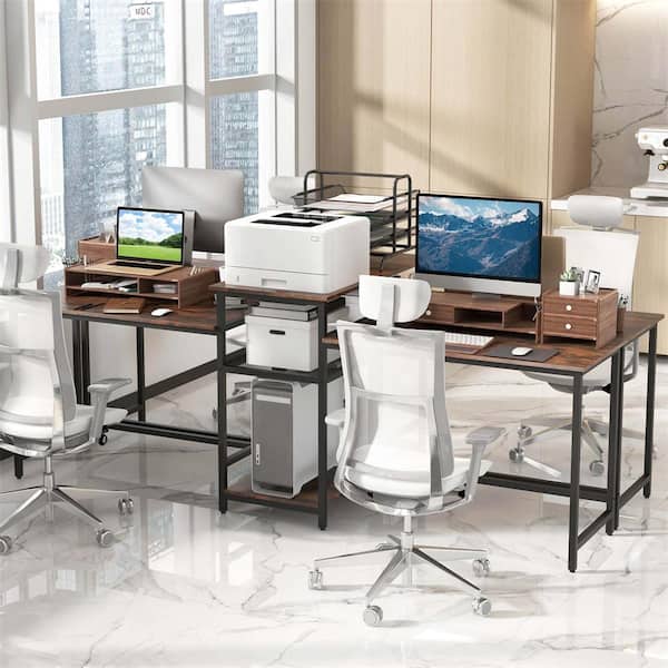 97 in. Rectangle Brown Wood 2-Person Desk Double Computer Desk with Power Outlets Printer Stand
