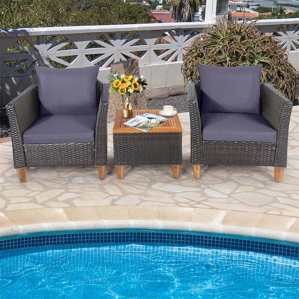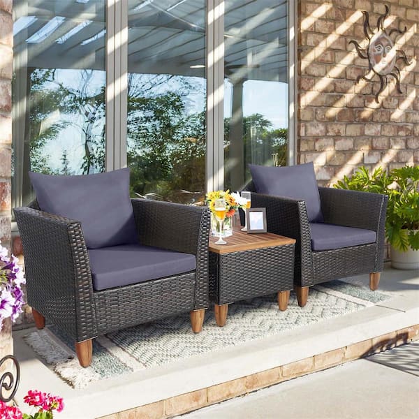 Black 3-Piece Wicker Patio Conversation Set with Grey Cushions